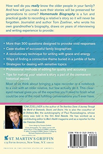 Description : Homemade Biography A practical guide to writing the biography of a close relative. It helps you unearth hidden chambers of memories, and anecdotes. It also includes tips on: What materials you will need; How to set the mood and gain trust; The right questions to ask to get started; How to get past sensitive subjects; and How to interview Alzheimer's patients. Full description